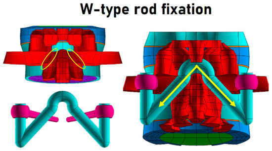Construct of the W-type fixation. The pars fracture (yellow ellipse) induces spinal instability. The W-type rod (yellow arrow) creates a new loading pathway.