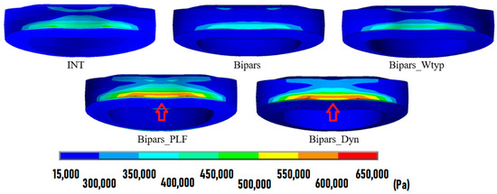In the Bipars_PLF and Bipars_Dyn models, the disc stress of the cranial segments increased by 29% and 19%, respectively, compared with the INT model. In the Bipars_Wtyp model, disc stress was 8% lower than in the INT model. Apparently, the high stress acted on the posterior region of the adjacent disc in the Bipars_Dyn and Bipars_Wtyp model, as shown in Figure 7. Minor changes were observed in the INT and Bipars_Wtyp model. It could be explained why early adjacent disc degeneration was observed in the B_PLF and Bipars_Dyn treatment. The adjacent segment FCFs were increased in the Bipars_PLF and Bipars_Dyn models by 32% and 19%, respectively; this value decreased in the Bipars_Wtyp model.