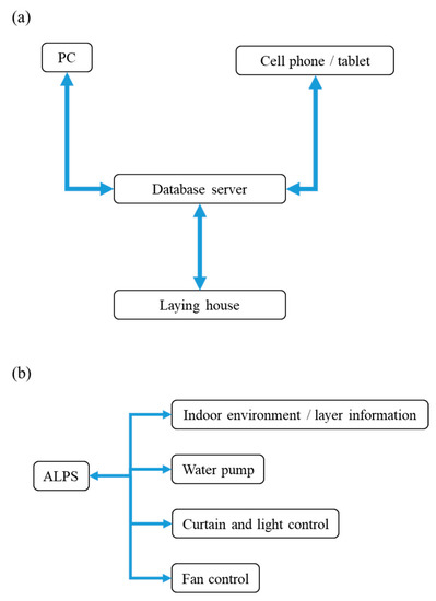In this study, we developed a preliminary version of an Artificial Intelligence Layer Production System (ALPS), as depicted in Figure 1a. ALPS utilizes IoT technology to regulate the indoor climate and environmental conditions of livestock houses. It enables control over various factors such as fan speed, temperature, humidity, ammonia and carbon dioxide concentration, the sprinkler system, intake door switch, and a small weather station. In the future, we plan to add biological data, such as animal body temperature, food intake, and the distribution of bacterial colonies in the pasture. Figure 1b illustrates the ALPS interface, which includes the indoor environment, layer information, water pump, curtain and light control, and fan control. The administrator can easily manage the indoor microclimate system through a mobile phone, tablet, or computer using the Internet.