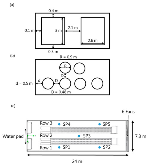 Figure 4a shows the water-pad system’s dimension drawing, while Figure 4b shows the fan’s dimension drawing. Figure 4c indicates the measurement points SP1-SP5’s locations. In the layer house, SP1 and SP4 were installed 7.2 m from the water-pad system, SP3 was installed 12.3 m away, and SP2 and SP5 were installed 22.7 m away. The measuring points’ heights were 2 m and 2.7 m. An environmental monitoring system consisting of CO2, temperature, and humidity sensors (AVC-310, Aecl Group, New Taipei City, Taiwan) was installed in the house to monitor the environment.