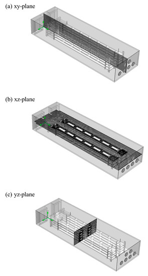 Mesh of layer house. (a) xy-plane; (b) xz-plane; (c) yz-plane.