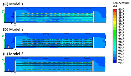 Temperature distribution of the three models’ yz plane of x = 2.6 m, at V = 6 m/s.
