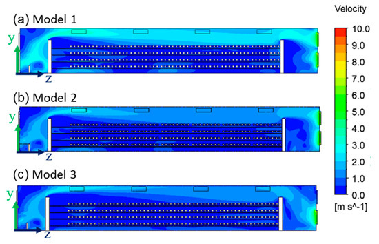 The velocity distribution in the house affected the temperature distribution. Figure 12 shows the air velocity contour inside the house. In Model 2, the four fans were located in the center aisle. The wind speed in the central aisle was more significant than in the aisles on both sides. Therefore, the temperature in the cage area of Model 2 was higher than that of the other two models. Figure 12c shows that the air inside Model 3 was forced out by the four fans below. The indoor temperature difference in Model 3 was similar to Model 1. However, Model 3 had only four fans, which helped the farm operators save energy and reduce operating costs.