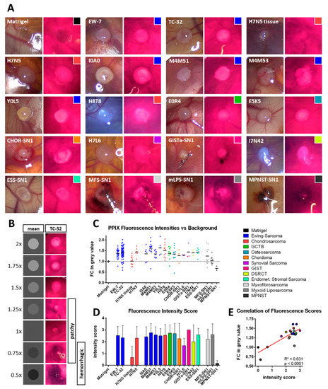 Photodynamic Diagnosis of Sarcoma xenografts on the chorio-allantoic membrane. (A) Overview of representative images of sarcoma xenografts upon white light (left images) and blue light (405 nm; right images) excitation. PPIX fluorescence presents as pinkish red. (B) For data visualization purposes, fold changes (FC) in mean grey values are depicted as grey circles on a grey background. TC-32 tumors with corresponding fluorescence intensities are shown adjacently. Tumors with an FC in mean grey value between 0.75 and 1.25 showed in most cases a patchy/partial fluorescence, while values below 1 were associated with a hemorrhagic phenotype. (C) FCs in mean grey value between tumors and their surrounding CAM tissue were calculated for all tested xenografts and cell-free Matrigel® as a control. (D) A fluorescence intensity score was determined qualitatively for each tumor visually while performing PDD. Mean intensity scores with the respective standard deviation are depicted. (E) Correlation of mean values of both intensity scores from (C,D). The legend shows the color code for the different sarcoma subtypes and is shared by (A,C–E).