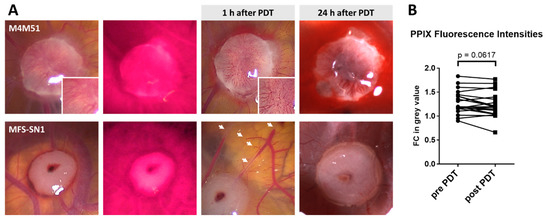 Macroscopic changes upon PDT treatment. (A) Examples of blood vessel fragmentation within (upper panel, compare zoom-ins before and after PDT) and surrounding (lower panel, indicated by white arrows) the tumor. Twenty-four hours after PDT, tumors presented as either hemorrhagic (upper panel) or ischemic (lower panel). (B) For a subgroup of tumors, PPIX fluorescence intensity was measured before (pre-PDT) and 1 h after PDT (post-PDT). The fold change (FC) in mean grey value of tumor against the background is depicted. Statistical analysis: paired Student’s t-test. M4M51 = Ewing sarcoma; MFS-SN1 = myxofibrosarcoma.