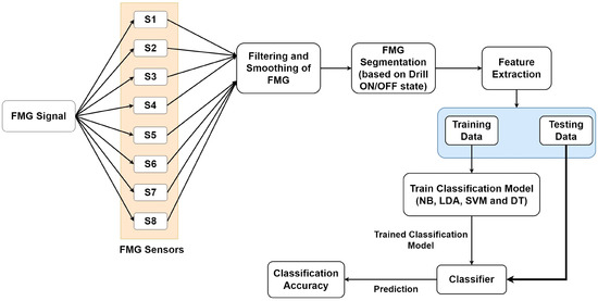 Participants’ eight-channel FMG data were imported into MATLAB R2020b for further analysis. As reported in the literature, a typical human hand movement frequency is less than 4.5 Hz [29]. Therefore, the collected FMG data of each participant was filtered using the low pass Butterworth filter of the fourth order with a cut-off frequency of 10 Hz. In addition, a 10-point moving average filter was used to further smoothen the FMG data. The complete FMG data of each participant was segmented into drilling and resting state based on the threshold value of the foot potentiometer marker. The segmented data were then forwarded to the feature extraction step. The complete methodology for FMG data analysis is shown in Figure 4.