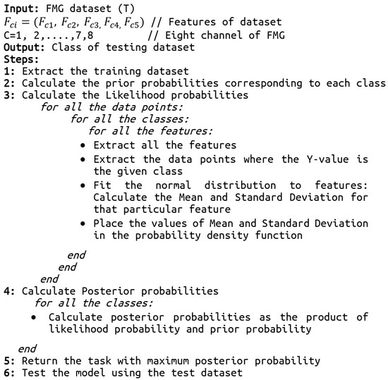 In this study, we evaluated the performance of naïve Bayes, linear discriminant analysis (LDA), support vector machine (SVM), and decision tree classifiers for classification of surgical skills into expert, intermediate, and novice categories. The naïve Bayes (NB) classifier is a subcategory of the Bayes classifier [32]. It is a supervised machine learning algorithm that is based on a probabilistic classification approach. It is best suited for the high dimensional dataset with the assumption that the predictors are independent of each other. The pseudo-code for skills assessment using FMG data with the naïve Bayes algorithm is given in Figure 5. LDA is a classifier which is flexible, powerful, and has low computational cost [33]. By examining the linear combinations of input variables, it separates the assigned classes. SVM classifiers are capable of learning from smaller amounts of data [34]. The implementation of SVM involves creating a hyperplane as a decision surface to maximize the distance between a positive and a negative example. It performs on a higher-level feature space which is created by nonlinearly transforming the n-dimensional input vector into a K-dimensional feature space. The decision tree is a classifier with tree structure, and is a powerful tool for classification [35]. It is composed of inner and leaf nodes, which represent decision thresholds and predictions, respectively. Comparison of extracted features with each inner node of the decision tree, from the root node to the leaf node, is the typical process of classification.