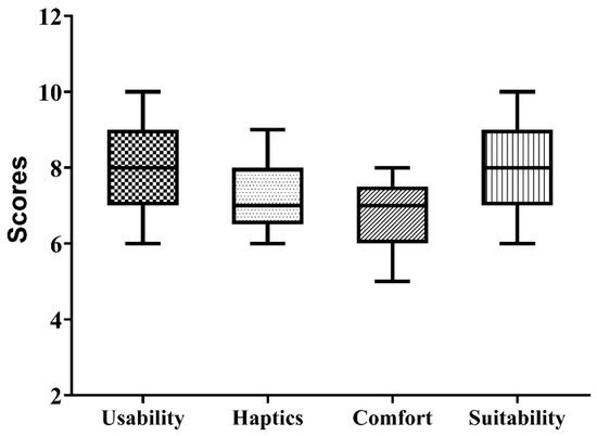 The results of the validation survey by neurosurgeons were compared by plotting boxplots, as shown in Figure 6. The results show that the vast majority of participants strongly felt that the craniotomy simulator was easy to use and had excellent value (average score = 8.0) for skill building outside the operating room. Regarding the haptic properties of the 3D printed bone matrix material, the material was found to have a good value (average score = 7.1) for use in surgical drilling simulation. The comfort of performing the activity while wearing the FSR band was also found to have a good value (average score = 6.7), and the participants reported no ergonomic discomfort while wearing the FMG band. The developed simulator was found to have excellent value (average score = 7.9) for inclusion in the neurosurgery residency program.