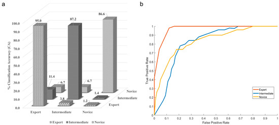 Here, the diagonal elements show the correctly classified class, while the non-diagonal shows the misclassification. The experts are 95% correctly classified as the experts, and the NB classifier misclassified experts as intermediate 3.8% of the time and as novices 1.2% of the time. The classification accuracy for correctly classifying intermediates was 87.2, while the NB classifier misclassified intermediate as experts 11.4% of the time and as novices 1.4% of the time. The novices are correctly classified 86.6% of the time, and the misclassification equally divides between the expert and novice at 6.7%. The graphical representation of the naïve Bayes classifier is also shown with the help of the ROC curve in Figure 7b. The confusion matrix and ROC curve indicate that the classifier is majorly confused between the expert and the intermediate class.