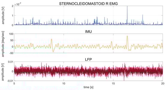 Patient DW08: time series of 20 s of recording of the right sternocleidomastoid muscle (first row), IMU (second row), and LFP (third row) during rest. The IMU time series were averaged over the three axes (x, y, z), and the LFP time series were averaged over the six contact pairs (0–3, 0–2, 1–3, left and right). The patient showed a dystonic tremor during the acquisition, as also confirmed by clinical notes and a video evaluation of the recording. The waveform of the tremor peaks captured by the IMU can also be observed in the LFPs.