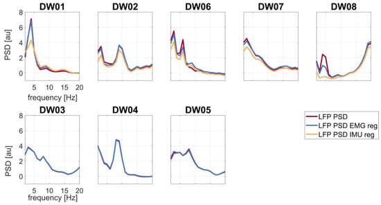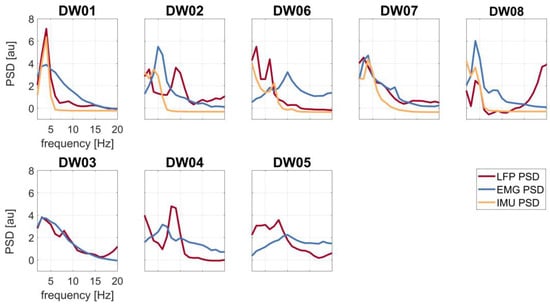 Two patients (DW01 and DW08) showed tremor contamination of the LFP, as suggested by the alignment of the frequency peaks in the PSDs around the head tremor frequency (DW01: f = 4 Hz, DW08: f = 4 Hz) (Figure 2).