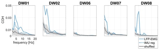 To investigate the effects of tremor-related artifacts on pallido-muscular COH, we computed LFP–EMG COH with and without regressing the IMU out of the LFP signals. LFP–EMG COH before IMU regression was small but significant with respect to shuffled data (Figure 5). IMU regression significantly reduced pallido-muscular COH in all but two subjects (DW06 and DW07) (Table 2 and Figure 5).