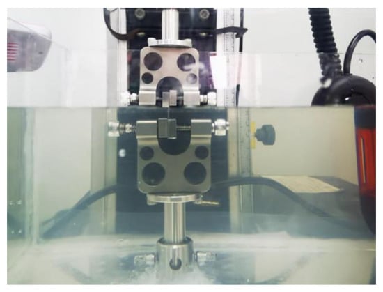 To obtain the mechanical properties of the corneal material, the corneal button was cut into a strip with 3 mm width and 12 mm length along the superior–inferior meridian. A commercial stress–strain extensometer (Instron 5544, Instron, Norwood, MA, USA) was used for the uniaxial stretch tests with a 5 N cell. To eliminate pre-stress, samples were preloaded through ten loading and unloading cycles with a magnitude of 0.01 N and a velocity of 2 mm/min before the formal test. During the formal testing, the samples were stretched to 5% strain (in the physiological strain range) at a velocity of 0.5 mm/min. The corresponding stress and strain were measured continuously. The stress was defined as applied force divided by the cross–sectional area (width multiplied by thickness); the strain was defined as an extension over the original length. The thickness of the corneas was obtained by SD–OCT. The elastic modulus, the gradient of the stress–strain curve, was calculated at different stress levels. Samples were immersed in 0.9% saline at room temperature during the whole experiment (Figure 1). To prevent the water surface fluctuation caused by the upward movement of the upper clamp when stretching, which affects the experimental accuracy, the clamp needed to be kept above the liquid level during uniaxial stretching.