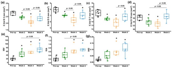 Changes in corneal volume and corneal morphological variation index measured by Pentacam. (a) C. Vol D 3 mm; (b) C. Vol D 5 mm; (c) C. Vol D 7 mm; (d) C. Vol D 10 mm; (e) ISV; (f) IVA; (g) IHD. * p < 0.05 vs. preoperative group.