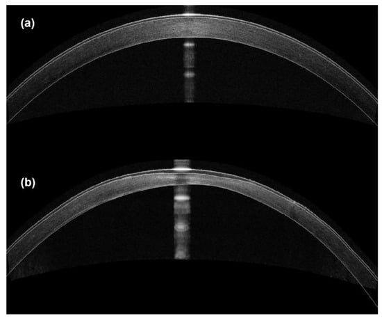 The representative SD-OCT images of the cornea (a) preoperatively and (b) at 4 weeks postoperatively.