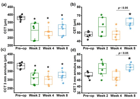 Changes in morphologic parameters measured by SD-OCT. (a) CCT; (b) CET; (c) CCT 3 mm annulus; (d) CET 3 mm annulus. * p < 0.05 vs. preoperative group.
