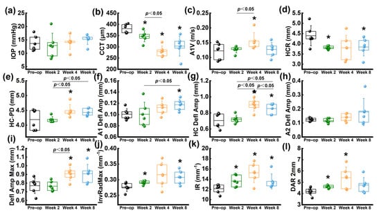 The parameters derived by Corvis ST. (a) IOP; (b) CCT; (c) A1V; (d) HCR; (e) HC−PD; (f) A1 Defl Amp; (g) HC Defl Amp; (h) A2 Defl Amp; (i) Defl Amp Max; (j) InvRadMax; (k) IR; (l) DAR 2 mm. * p < 0.05 vs. preoperative group.