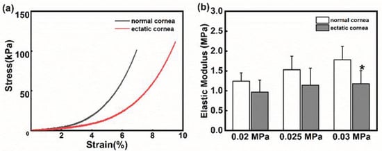(a) The stress–strain curves of the normal cornea (gray line) and the ectatic cornea (red line); (b) Changes in the elastic modulus in the normal cornea and ectatic cornea at different stress levels. * p < 0.05 vs. normal cornea.