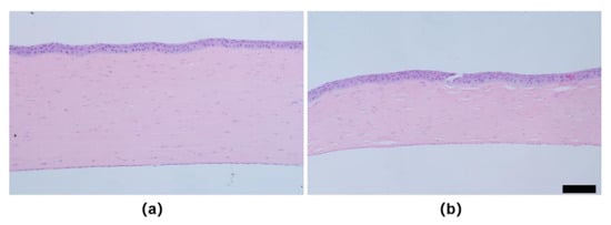 The H&E staining corneal sections of rabbits at 8 weeks. (a) normal cornea; (b) ectatic cornea (The scale bar is 100 μm).