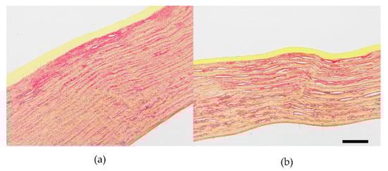 The Picrosirius red staining corneal sections of rabbits at 8 weeks. (a) normal cornea; (b) ectatic cornea (The scale bar is 100 μm).