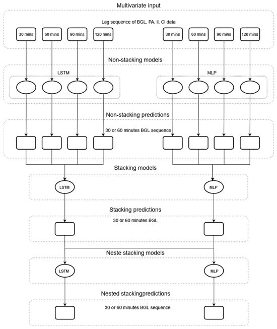 A non-stacking model takes a specific length of historical blood glucose, physical activity, carbohydrate, and bolus insulin data as multivariate input and returns a sequence of forecasted future blood glucose levels over a predefined prediction horizon of 30 or 60 min. According to the diagram in Figure 1, for each prediction horizon of 30 and 60 min, eight non-stacking models are created in aggregate. For this purpose, a multilayer perceptron network and a long short-term memory network are trained separately on four different lag lengths of 30, 60, 90, and 120 min.