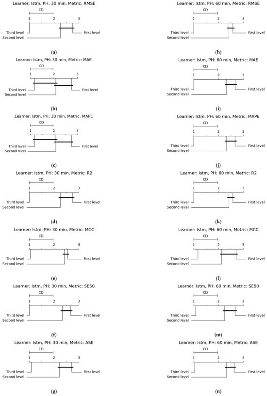 Critical difference diagrams based on Nemenyi test for pairwise comparison of the non-stacking, stacking, and nested stacking modelling approaches: (a) LSTM learner, 30 min PH, and RMSE metric, (b) LSTM learner, 30 min PH, and MAE metric, (c) LSTM learner, 30 min PH, and MAPE metric, (d) LSTM learner, 30 min PH, and r2 metric, (e) LSTM learner, 30 min PH, and MCC metric, (f) LSTM learner, 30 min PH, and SE50 metric, (g) LSTM learner, 30 min PH, and ASE metric, (h) LSTM learner, 60 min PH, and RMSE metric, (i) LSTM learner, 60 min PH, and MAE metric, (j) LSTM learner, 60 min PH, and MAPE metric, (k) LSTM learner, 60 min PH, and r2 metric, (l) LSTM learner, 60 min PH, and MCC metric, (m) LSTM learner, 60 min PH, and SE50 metric, (n) LSTM learner, 60 min PH, and ASE metric. Note. LSTM: long short-term memory; PH: prediction horizon; RMSE: root mean square error; MAE: mean absolute error; MAPE: mean absolute percentage error; r2: coefficient of determination; MCC: Matthew’s correlation coefficient; SE: surveillance error; ASE: average surveillance error.
