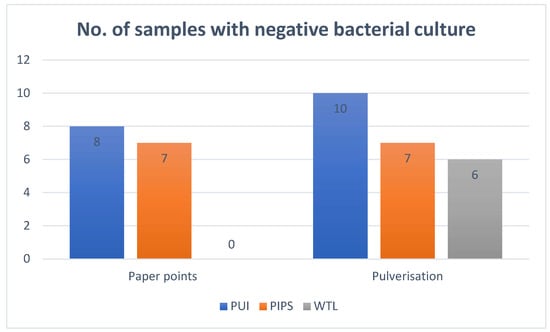 Bar chart illustrating the number of samples with negative bacterial cultures using paper-point and pulverisation sampling methods after final rinsing with different irrigation protocols.