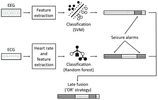 The multimodal framework employs a late fusion technique with an ‘OR’ strategy [21]. Here, the classification output of each modality is integrated in a way that a seizure detection is counted if an alarm is present in either the bte-EEG or ECG, focusing on achieving high sensitivity. The output of the multimodal algorithm is composed of a union of the unimodal algorithms’ detections and, in the case of an overlapping alarms, the bte-EEG detection segment was taken. Figure 1 shows a graphical representation of the complete multimodal framework.