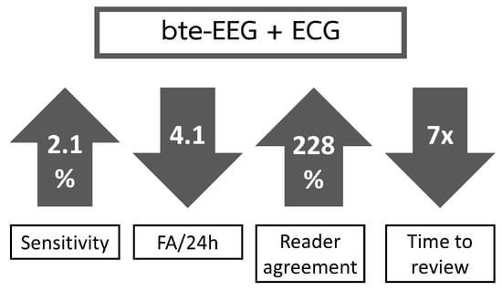 Diagram representing the gain in sensitivity, inter-rater agreement, and reduction of false alarms by reviewing the data with the semi-automated multimodal framework (bte-EEG and ECG) compared with the unimodal framework (bte-EEG). The reduction in the time to review is compared with the reported time to review 24 h of bte-EEG recordings without automated assistance.