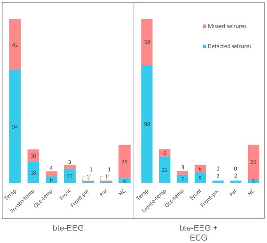 The readers correctly annotated 136 alarms in the first experimental setup and 143 in the second. Figure 4 discriminates the number of detected and missed seizures by the two readers in the two experiments for each seizure onset location in the dataset. The number of detected seizures is higher in the bte-EEG and ECG setup for all types except frontal and non-clear seizure onset locations. The highest number of mislabeled seizure alarms corresponds to temporal (42 and 38) and non-clear (28 and 29) seizure localizations (in the bte-EEG setup and bte-EEG and ECG setup, respectively).