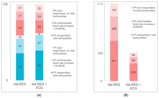When considering the patient’s status in terms of having ictal heart rate changes, we can see that using ECG data improves the detection sensitivity of the responders (patients with ictal tachycardia or an increase in heart rate of more than 20 BPM was observed). From Figure 5a, both readers correctly annotated more seizures of responder patients when ECG and heart rate data were present along with the bte-EEG (mean increase of 8 seizures detected). In addition, the readers achieved better sensitivity for patients who had an intermediate tachycardia effect (increase in heart rate of less than 20 BPM) during the seizure. Both readers mislabeled a mean of five more seizure detections in the non-responders group when ECG data were shown. Regarding the false detections, the number of alarms incorrectly classified as seizures by the readers decreased substantially in patients of all statuses. Figure 5b depicts the number of FPs annotated by the readers in each experimental setup. In the bte-EEG only experimental setup, a mean of 1177 FPs was reported, whereas in the bte-EEG and ECG review, the readers achieved a mean of 428 false detections. The difference in the number of FPs between experimental setups was higher in patients who had ictal tachycardia (mean difference of 346).