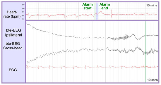 Example of a detected seizure segment correctly labeled by the readers on the bte-EEG experimental setup but mislabeled on the bte-EEG and ECG and heart rate setup (change from TP to FN). The top plot contains the heart rate data in red within a 10 min window, and the bottom contains the bte-EEG channels (in black) and ECG data (in red) within a 10 s window. The shaded section of the heart rate plot corresponds to the plotted area of the bottom one. The green vertical lines indicate the automated algorithm’s time events.