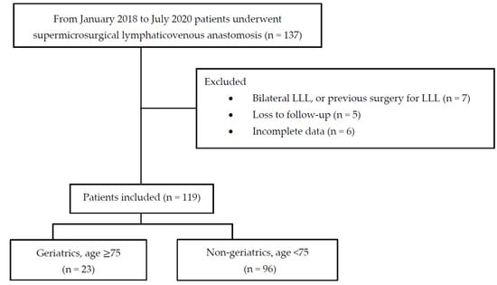 - Yang, J.C.; Wu, S.C.; Lin, W.C.; Chiang, M.H.; Chiang, P.L.; Hsieh, C.H. Supermicrosurgical lymphaticovenous anastomosis as alternative treatment option for moderate-to-severe lower limb lymphedema. J. Am. Coll. Surg. 2020, 230, 216–227. [Google Scholar] [CrossRef] [PubMed]