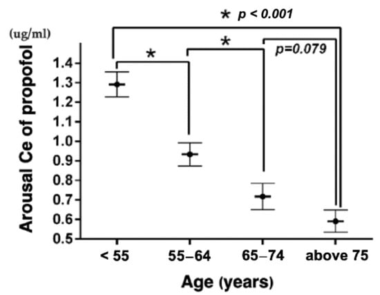 - Schnider, T.W.; Minto, C.F.; Shafer, S.L.; Gambus, P.L.; Andresen, C.; Goodale, D.B.; Youngs, E.J. The influence of age on propofol pharmacodynamics. Anesthesiology 1999, 90, 1502–1516. [Google Scholar] [CrossRef] [PubMed]