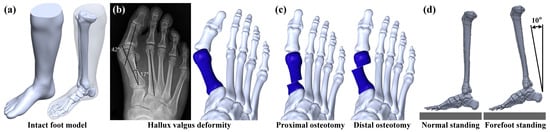 (a) The intact foot numerical model; (b) the foot model with hallux valgus deformity; (c) two types of metatarsal osteotomy methods; and (d) two types of foot standing postures.