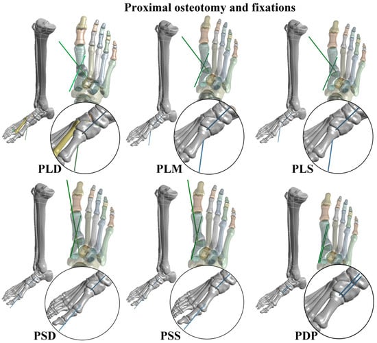 Six types of proximal metatarsal osteotomy (PMO) and Kirschner wire fixation strategies.