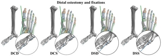 - Zhang, Q.; Zhang, Y.; Huang, J.; Teo, E.C.; Gu, Y. Effect of Displacement Degree of Distal Chevron Osteotomy on Metatarsal Stress: A Finite Element Method. Biology 2022, 11, 127. [Google Scholar] [CrossRef]