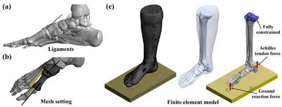 (a) The foot ligaments of the numerical model; (b) the mesh setting of the foot model with the osteotomy and Kirschner wire fixation; and (c) the finite element model of the foot with the loading and boundary conditions.