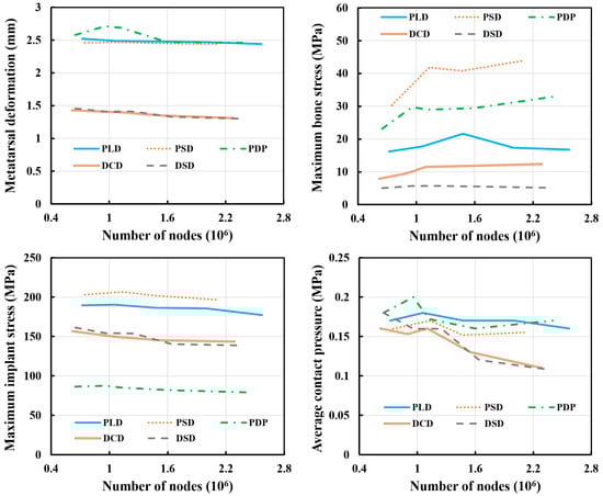 We conducted numerical convergence analysis of the hallux valgus deformity models after treatments. The element quality was used as the element quality criteria, with an average result of 0.8. We obtained the metatarsal deformation, maximum bone stress, maximum implant stress, and average contact pressure of the finite element models in terms of the number of nodes (Figure 5). The total number of nodes of the osteotomy and fixation methods for the convergence study ranged from 620,000 to 2,600,000. All performances of the finite element models converged properly when the number of nodes was larger than 2,000,000. The error due to the different number of nodes was less than 10%. All output performances that satisfied the convergence criterion were used in the following analyses and comparisons.