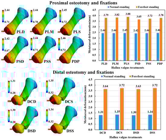 The maximum bone deformation was calculated to evaluate the stability of various osteotomy and fixation strategies. The maximum deformation occurred on the distal side of the bone for all osteotomy and fixation methods (Figure 6). In the case of proximal osteotomy and fixations (POFs), the metatarsal deformation of forefoot standing ranged from 3.65 to 3.88 mm, while normal standing ranged from 2.42 to 2.46 mm. Thus, the hallux valgus correction model with the forefoot standing posture had higher metatarsal deformation than the normal standing posture. However, different POF strategies had minor effects on metatarsal deformation under the same foot posture. In the case of distal osteotomy and fixations (DOFs), the metatarsal deformation of forefoot standing ranged from 3.63 to 3.72 mm, while normal standing ranged from 1.30 to 1.35 mm. Thus, the hallux valgus correction model with the forefoot standing posture had higher metatarsal deformation than the normal standing posture. Different DOF methods also had minor effects on metatarsal deformation under the same foot posture. Comparing the two kinds of osteotomy methods, the POF method revealed higher metatarsal deformation than the DOF method in the normal standing posture. However, the difference between the two kinds of osteotomy methods was insignificant in the forefoot standing posture (Figure 6).