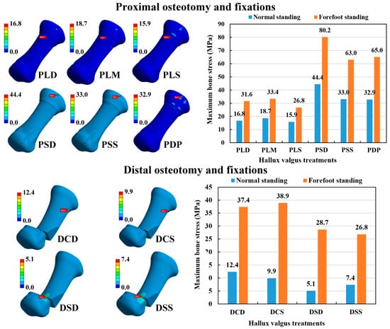 The maximum bone stress was calculated to evaluate the risk of bone fracture after various osteotomy and fixation strategies. The maximum metatarsal bone stress occurred at the insertion hole of the Kirschner wires for all the osteotomy and fixation methods (Figure 7). In the POF conditions, the hallux valgus correction model with the normal standing posture had lower metatarsal bone stress than the forefoot standing posture. The bone stress of the large cross-angle fixations (PLD, PLM, and PLS) ranged from 15.9 to 33.4 MPa, while the bone stress of the other fixations ranged from 33.0 to 80.2 MPa. Thus, POM combined with large cross-angle fixations (PLD, PLM, and PLS) had lower bone stress than small cross-angle fixations (PSD and PSS) and double parallel wire fixation (PDP) under the same foot posture. Under the DOF conditions, the hallux valgus correction model with the normal standing posture had lower metatarsal bone stress than with the forefoot standing posture. The bone stress of single Kirschner wire fixations (DSD and DSS) ranged from 5.1 to 28.7 MPa, while the bone stress of the other fixations ranged from 9.9 to 38.9 MPa. Thus, DMO combined with single Kirschner wire fixations (DSD and DSS) had lower metatarsal bone stress than with two cross-angle Kirschner wire fixations (DCD and DCS) under the same foot posture. Comparing the two kinds of osteotomy methods, the DOF method revealed relatively lower metatarsal bone stress than the POF method (Figure 7).