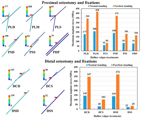 The maximum implant stress was calculated to evaluate the possibility of the Kirschner wire failure. The maximum implant stress occurred mainly on the wire’s exterior surface near the osteotomy site for all the osteotomy and fixation strategies, except for the PSS fixation strategy, in which it occurred at the metatarsophalangeal joint; and in the DCD, DSD, and DSS strategies, in which it occurred at the end of the metatarsal bone (Figure 8). In the POF conditions, the implant stress of forefoot standing ranged from 84 to 418 MPa, while normal standing ranged from 61 to 208 MPa. Thus, the hallux valgus correction model with the normal standing posture had lower implant stress than the forefoot standing posture. The PMO combined with either shallow insertion fixations (PLS and PSS) or double parallel wire fixation (PDP) had lower implant stress than the other fixations under the same foot posture. In the DOF conditions, the implant stress of forefoot standing ranged from 35 to 372 MPa, while normal standing ranged from 22 to 139 MPa. Thus, the hallux valgus correction model with the normal standing posture had lower implant stress than the forefoot standing posture. The DMO combined with shallow insertion fixations (DCS and DSS) had lower implant stress than the other fixations under the same foot posture. Comparing the two kinds of osteotomy methods, the DOF method revealed slightly lower implant stress than the POF method (Figure 8).
