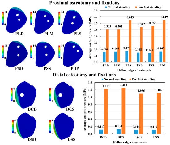 The contact pressure distribution on the osteotomy surface of various fixation methods was obtained (Figure 9). Based on these contact pressure results, we calculated the average contact pressure, which summarized the contact pressure from the osteotomy surface divided by the surface area. In the POF conditions, the average contact pressure of forefoot standing ranged from 0.503 to 0.649 MPa, while normal standing ranged from 0.141 to 0.174 MPa. Thus, the hallux valgus correction model with the forefoot standing posture had higher average contact pressure than the normal standing posture. The PMO combined with either large cross-angle and shallow insertion fixation (PLS) or double parallel wire fixation (PDP) had higher average contact pressures than the other fixations under the same foot posture. In the DOF conditions, the average contact pressure of forefoot standing ranged from 1.096 to 1.254 MPa, while normal standing ranged from 0.112 to 0.130 MPa. Thus, the average contact pressure of the hallux valgus correction model with the forefoot standing posture was significantly higher than the normal standing posture. The DMO combined with either of two cross-angle Kirschner wire fixations (DCD and DCS) had higher average contact pressures than single Kirschner wire fixations (DSD and DSS) under the same foot posture. Comparing the two kinds of osteotomy methods, the POF method revealed higher average contact pressure than the DOF method in the normal standing posture. However, the latter revealed higher average contact pressure than the former in the forefoot standing posture (Figure 9).