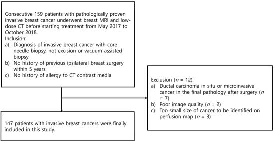 The Institutional Review Board of Korea University Ansan Hospital approved this prospective study. Written informed consent was received from all participants. Consecutively, 159 women with pathologically proven invasive breast carcinomas underwent dynamic contrast-enhanced breast MRI and low-dose breast CT before starting treatment from May 2017 to October 2018. These participants were included in two previous prospective studies to evaluate the usefulness of histogram and perfusion analyses on CT or MRI used to predict prognostic factors in breast cancer [,]. In the current study, we compared the associations between image-analyzing parameters and histological biomarkers and survival outcomes of breast cancers on low-dose CT and MRI. Inclusion criteria for this study were as follows: (a) patients diagnosed pathologically with invasive breast carcinomas with core needle biopsy, not excision or vacuum-assisted biopsy; (b) patients without previous ipsilateral breast surgery within the last five years; and (c) patients with no history of allergic reaction to CT contrast media. Twelve patients were excluded because of ductal carcinoma in situ or microinvasive cancer in the final pathologic report after the operation (n = 7), image quality degradation due to motion artifact (n = 2), or cancer of too small a size to be identified on perfusion map (n = 3). Finally, 147 women (mean age 52.3 years, age range 25–81 years) with invasive breast carcinomas were included in our study. Figure 1 summarizes the study population, and Table 1 shows the tumor characteristics. Tumor sizes on MRI ranged from 6 to 109 mm (mean size ± standard deviation 23.9 ± 14.8 mm).