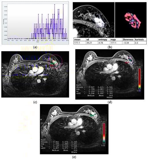 Histogram and perfusion analyses conducted on breast MRI in a 42-year-old woman with a 30 mm triple-negative invasive ductal carcinoma of the left breast (a,b). Histogram analysis on MRI: Axial contrast-enhanced T1-weighted MRI image shows an oval shaped, irregular marginated, and heterogeneous enhancing mass in the left breast. The region of interest (ROI) was drawn manually for the entire tumor, and a histogram was obtained (a). From the histogram, six statistically based metrics were extracted: mean, standard deviation (SD), mean of positive pixels (MPP), entropy, skewness, and kurtosis (b). (c–e) Perfusion analysis on MRI: Two ROIs (ROI1: entire tumor and ROI2: hot spot) were manually delineated (c), and eight perfusion parameters from each ROI were obtained: median and mean values of Ktrans, kep, Ve, and iAUC (d,e).