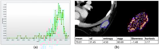 Low-dose perfusion CT was performed according to a previous study []. CT was conducted using an IQon Spectral CT scanner (Philips Health Systems, Cleveland, OH, USA). An additional table pad with a rectangular hole was inserted for placing the breast on a normal CT table for examination in the prone position [,]. A radiologist (B.K.S) evaluated prior mammography, ultrasound, or MRI before the CT scans and performed a targeted ultrasound to localize the tumor. After localizing the cancer, a skin marker (X-spot; Beekley Medical, Bristol, CT, USA) was applied to the skin at the cancer site. Low-dose perfusion CT was performed as follows: tube voltage 80 kVp, tube current 25 mA or 30 mA, collimation 64 mm × 0.625 mm, rotation time 0.5 s, matrix 512 × 512, and slice thickness 5 mm. The scan range was 40 mm along the z-axis, including the skin markers. After setting the scan range on a precontrast scan, the skin marker was removed, and contrast media was injected. A total of 60 mL of Xenetix 350 (Guerbet, Aulnay-sous-Bois, France) was administered at a rate of 4 mL/s. Eighteen scans were performed at 3 s intervals after contrast media injection, and four scans at 30 s intervals (effective dose for each patient, 1.01–1.38 mSv). Histogram features on CT were analyzed using the same commercial software as MRI. Perfusion features were calculated with a maximum slope algorithm using a commercial software (Functional CT; Philips Health Systems). On CT, 12 histogram parameters and 8 perfusion parameters were obtained from each tumor.