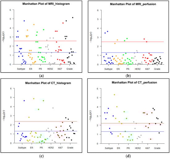 Manhattan plots representing the association between MRI or CT parameters and histological biomarkers. A p value < 0.003 (0.05/18 parameters) for MRI histogram features, a p value < 0.003 (0.05/16 parameters) for MRI perfusion features, a p value of < 0.004 (0.05/12 parameters) for CT histogram features, and a p value < 0.006 (0.05/8 parameters) for CT perfusion features were used to decide significance using Bonferroni correction for multiple comparisons. A blue line represents p < 0.05, and red line represents corrected p values after Bonferroni correction for each imaging analysis. (a) Histogram analysis on MRI: Histogram parameters were significantly associated with all histological findings, such as molecular subtype, expression of estrogen receptor (ER), progesterone receptor (PR), human epidermal growth factor receptor 2 (HER2), and Ki67, and grade (p < 0.003). (b) Perfusion analysis on MRI: Perfusion parameters were significantly correlated with the status of subtype, ER, PR, and Ki67 (p < 0.003). (c) Histogram analysis on CT: Histogram parameters were significantly associated with all histological biomarkers except for Ki67 expression (p < 0.004). (d) Perfusion analysis on CT: Perfusion parameters were significantly correlated with all histological findings (p < 0.006).