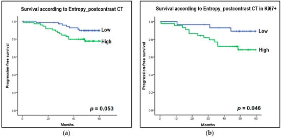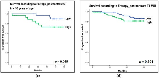 Kaplan–Meier curves to estimate progression-free survival (PFS) according to the entropy of histogram parameters on CT and MRI. For survival analysis, the collected CT and MRI histogram parameter data were dichotomized based on median value. (a) Entropy on postcontrast CT: High entropy group (>4.62 Hounsfield unit [HU]) on postcontrast CT images showed decreased PFS compared to the low entropy group (≤4.62 HU) on postcontrast CT images (p = 0.053). (b) Entropy on postcontrast CT in Ki67-positive group: In the subgroup analysis, in Ki67-positive patients, the group with high postcontrast CT entropy (>5.10 HU) showed a statistically significant decrease in PFS compared to the group with low postcontrast CT entropy (≤5.10 HU) (p = 0.046). (c) Entropy on postcontrast CT in the younger age group, less than 50 years: In the subgroup analysis, the high postcontrast CT entropy group (>5.06 HU) showed a reduced PFS in the younger age group (age <50 years), but this was not statistically significant (≤5.05 HU) (p = 0.065). (d) Entropy on postcontrast T1-weighted MRI: The high entropy group (>4.95) on postcontrast T1-weighted MRI showed a decrease in PFS compared to the low entropy group (≤4.95), but this was not statistically significant (p = 0.301).