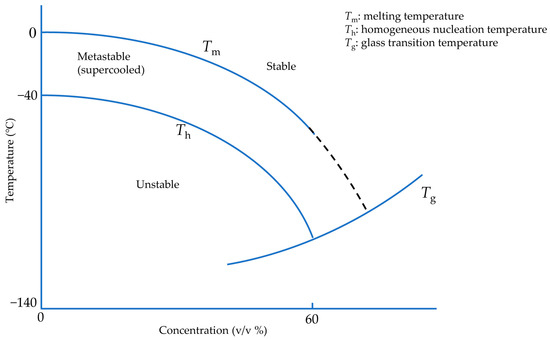 Cryoprotective agents (CPAs) are defined as chemicals that mitigate or eliminate ice damage and reduce high ionic concentrations during cryopreservation [188]. As evidenced by the phase diagram in Figure 1, it is possible to cool cells and tissues without any ice formation with an unlimited amount and concentration of CPAs. In practice, there are two kinds of CPA. The first is “penetrating” or “permeating” CPAs, which have low molecular mass and can pass through the cell membrane and include (among others): ethylene glycol, propylene glycol, dimethylsulfoxide, glycerol, formamide, and methanol. The second is “non-permeating” CPAs with high molecular mass and cannot pass cell membranes, such as trehalose, sucrose, polyethylene glycol, polyvinyl alcohol, and polyvinyl pyrrolidone [189,190]. In fact, CPAs cause changes in hydrogen bonds between water molecules to inhibit ice formation [191]. While the CPA concentration increases, the translational movement of water and CPA molecules reduces [192,193,194]. The reduction of the water molecule diffusion coefficient postpones the gathering of water molecules in supercooled or heterogeneous regions to form ice crystal clusters, resulting in delaying ice formation (melting point decreases) and promoting glass formation [190]. The translational, vibrational, and rotational movements of water molecules, restricted in the vitreous state, are reduced in aqueous solutions with CPA [195,196]. As a result, the glass transition temperature increases in solutions containing CPAs.