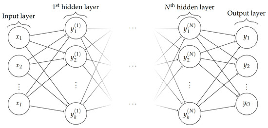 Typical Feed-forward Neural Network (FFNN) with O output nodes, I input nodes, and N hidden layers with k nodes/neurons each.